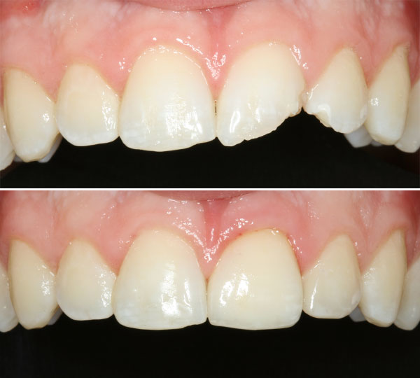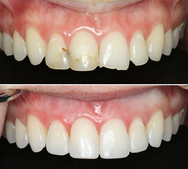 When restoring teeth damaged by trauma, careful attention is paid to the shape, contour, texture and shade in order to provide restorations that are often indistinguishable from natural teeth. Look closely at the edges and corners to see how the hand sculpting and custom characterizing allows the restorations to blend in seamlessly with the adjacent natural teeth.